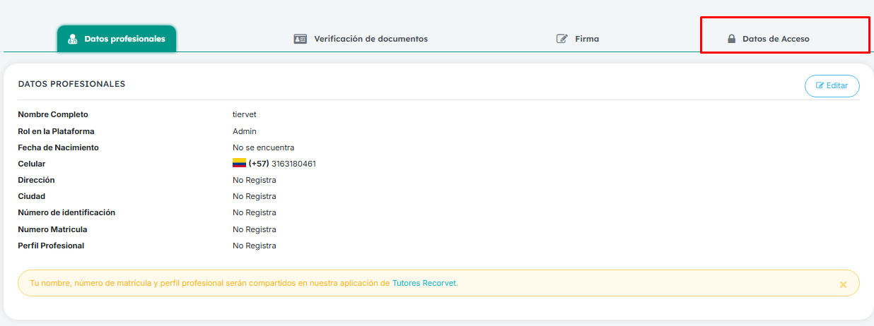 Nota: Para verificar tu perfil debes completar 3 secciones: Datos de Acceso, Datos del Profesional y verificación de título profesional.