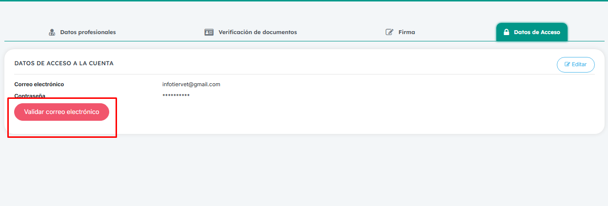 2. En datos de acceso, debes hacer clic en el botón “Validar correo electrónico”, luego de verificar que este es correcto, sino debes primero editarlo.