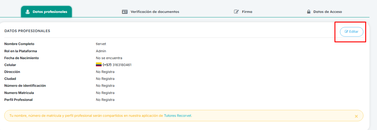 3. En datos del profesional, debes hacer clic en el botón editar para abrir la ventana que te permitirá actualizar la información aquí señalada: