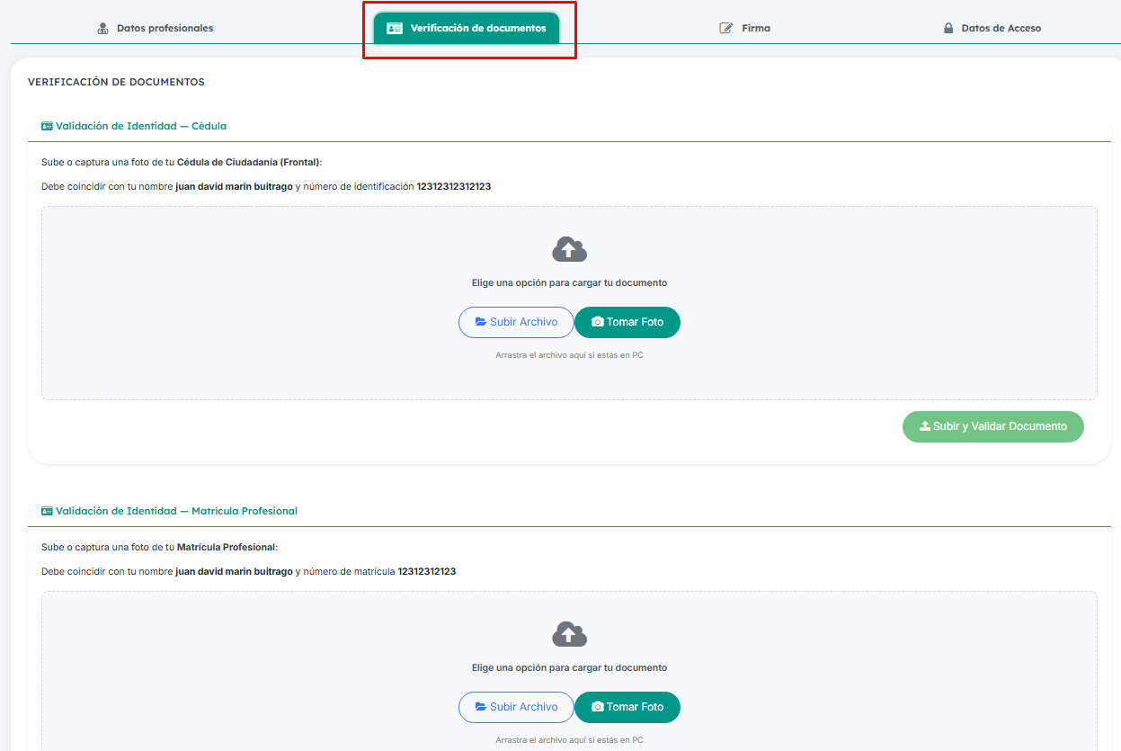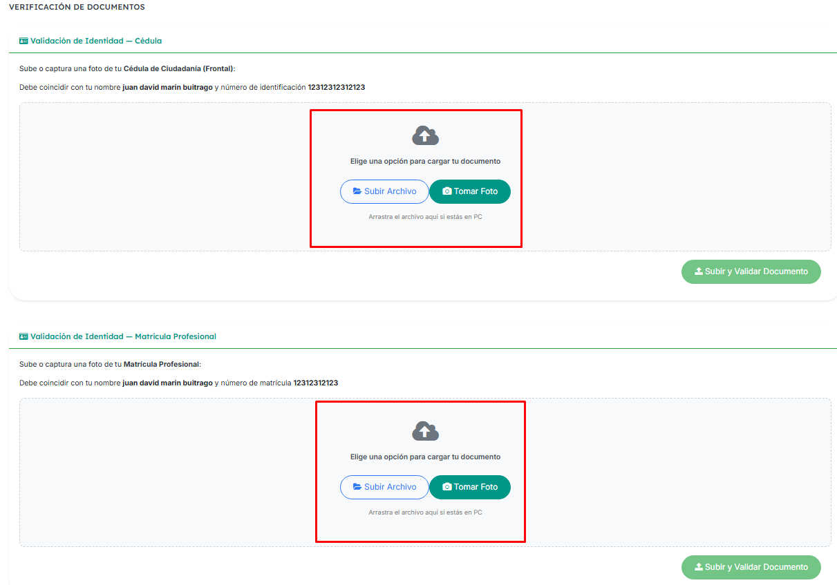 4. En la sección verificación de título profesional, debes adjuntar una imagen de tu documento de identidad y otra imagen de tu matrícula profesional o documento que avale tu título profesional, haciendo clic en los botones señalados: