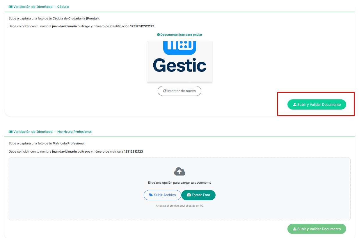Una vez realizados los anteriores pasos debes presionar el botón de "subir y validar documento"