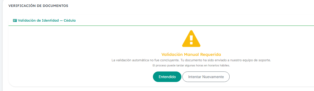 Al dar entendido nuestro equipo será notificado y tus documentos serán verificados de manera manual lo antes posible.