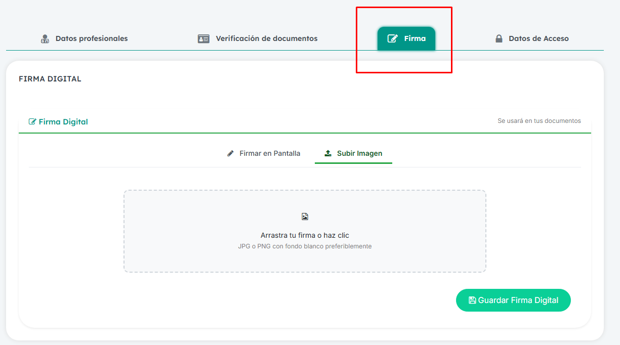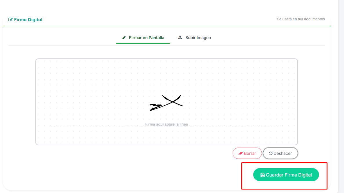Una vez hayas seleccionado la imagen o dibujado tu firma debes dar clic en el botón "Guardar Firma Digital", una vez hecho esto tu firma apareceré en los documentos que generes.