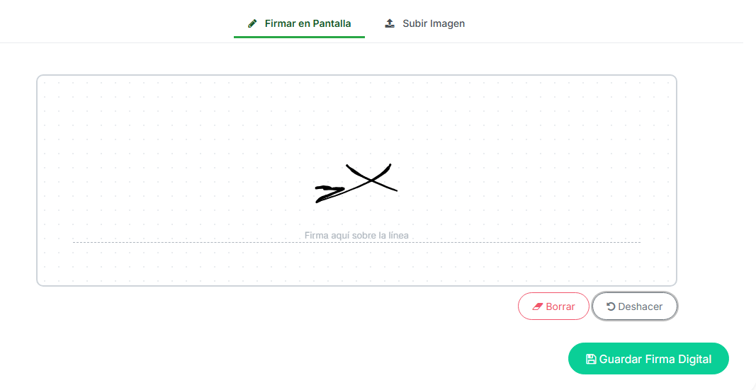 Puedes optar por dos opciones, 1, subir la imagen de tu firma que hayas previamente guardada en tu equipo, dando clic en el recuadro y seleccionando tu imagen, o yendo al apartado "Firmar en Pantalla" donde verás un recuadro en el cuál podrás dibujar y replicar tu firma